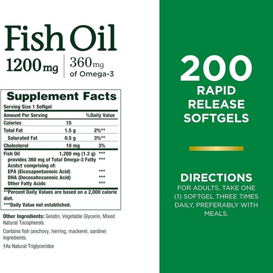 Nature's Bounty Óleo de Peixe, 1200 mg, 360 mg de Ômega-3, 200 Cápsulas Gelatinosas