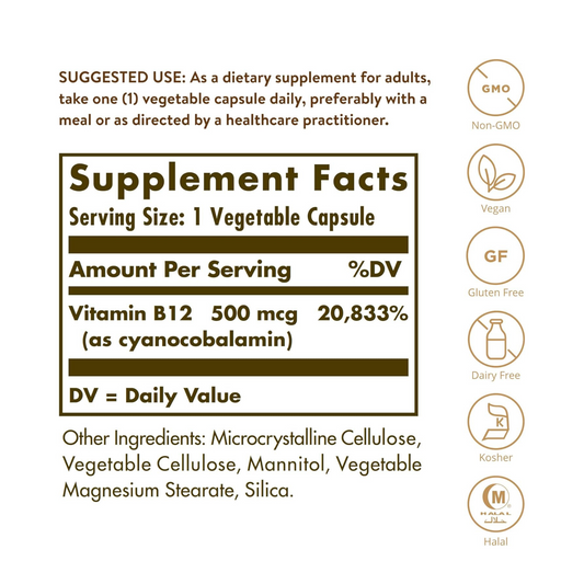 Solgar, Vitamina B12, 500 mcg, 250 Cápsulas Vegetais