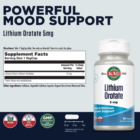 KAL Orotato de Lítio, 5 mg com Extrato de Farelo de Arroz Orgânico, 120 VegCaps