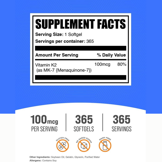 BulkSupplements Vitamina K2 MK7, 100mg por Porção, 365 Cápsulas Gelatinosas