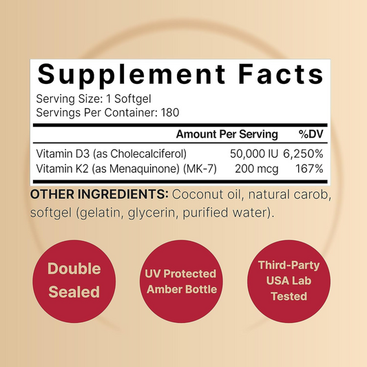 NatureBell Vitamina D3 50.000 UI + K2 MK-7 200 mcg com Óleo de Coco, 180 Cápsulas