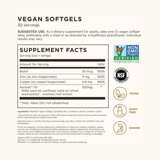 Solgar Hair Growth, Nutrição Antienvelhecimento para Crescimento Capilar, Keranat Oil, Biotina, Zinco e Cobre, 30 Cápsulas Veganas